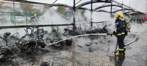 2023年2月23日,江苏镇江一企业停车棚发生火灾。起火建筑为敞开式车棚,主要燃烧物为电动自行车。经过约半小时的扑救,火灾被成功扑灭。据了解,当时车棚内停靠了约90余辆电动自行车,约70余辆被烧得只剩骨架。所幸扑救及时,现场未造成人员伤亡。发生火灾时,事发车辆正处充电状态,具体原因正在进一步调查之中。04