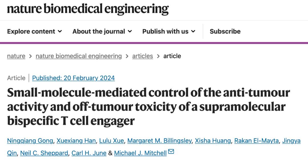 2024年2月20日,宾夕法尼亚大学 Michael Mitchell 团队(宫宁强博士为第一作者),在 Nature Biomedical Engineering 期刊发表了题为:Small-molecule-mediated control of the anti-tumour activity and off-tumour toxicity of a supramolecular bispecific T cell engager 的研究论文。