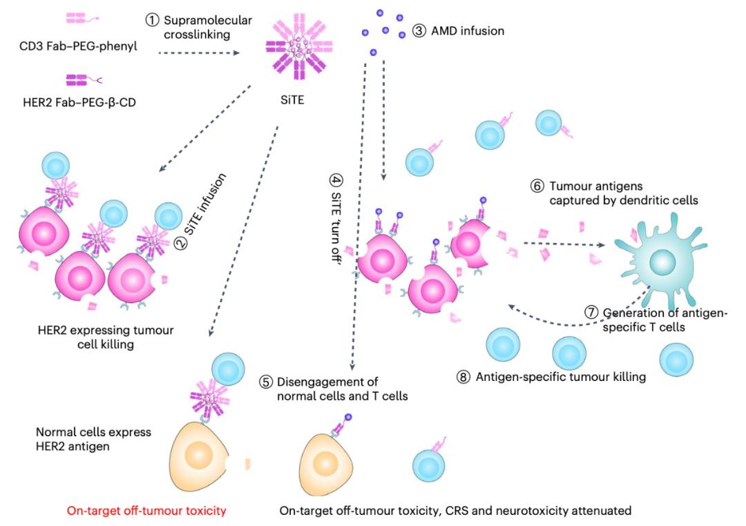 该研究开发了一种可切换的双特异性T细胞纳米接合器(SiTE),基于该方法开发的CD3×HER2双特异性抗体诱导了强烈的肿瘤特异性适应性免疫反应,防止了肿瘤复发。更重要的是,使用已获FDA批准的小分子药物金刚烷胺(AMD)分解超分子聚集体,使T细胞与肿瘤细胞分开,停止CD3×HER2产生的肿瘤非靶向毒性、细胞因子释放综合征和神经毒性。