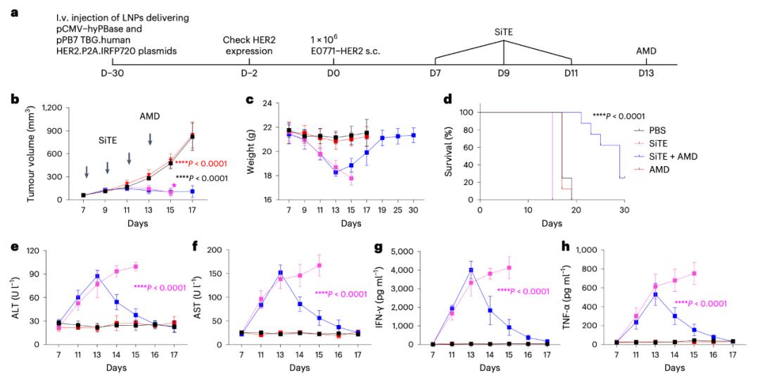 此外,该研究开发了一种在健康肝脏组织中稳定表达人类HER2的小鼠模型,并研究了SiTE引起的非肿瘤毒性。该研究还比较了低剂量和高剂量下SiTE的治疗效果和抗肿瘤活性。并利用人源化免疫系统小鼠模型比较了SiTE和BiTE(blinatumomab)的抗肿瘤效果、肿瘤非靶向毒性、细胞因子释放综合征和神经毒性。