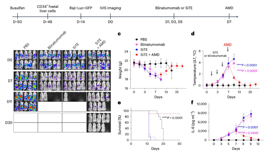 AMD降低SiTE在体内诱导细胞因子释放综合征(CRS)总的来说,研究结果表明,SiTE可以诱导有效的抗肿瘤活性,且不会产生严重的肿瘤非靶向毒性、细胞因子释放综合征和神经毒性,这可能作为未来设计癌症免疫治疗的双特异性抗体的广泛适用策略,以避免非肿瘤毒性的产生。
