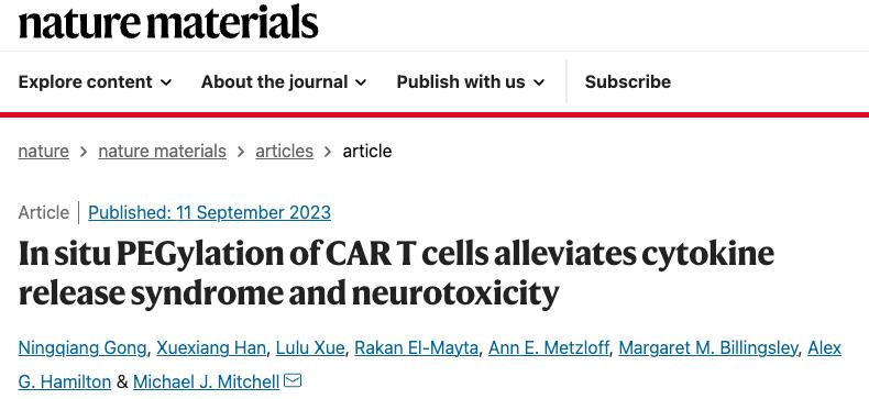 值得一提的是,2023年9月11日,宫宁强博士作为第一作者在 Nature Materials 期刊发表了题为:In situ PEGylation of CAR T cells alleviates cytokine release syndrome and neurotoxicity 的研究论文【2】。