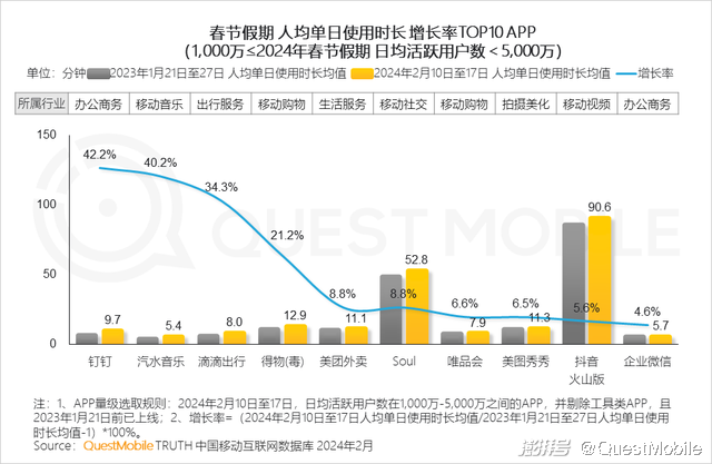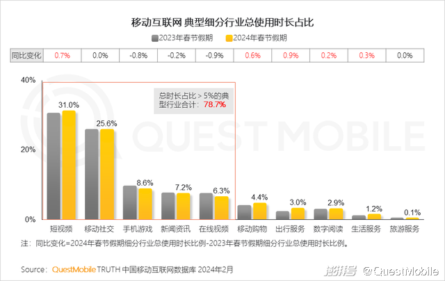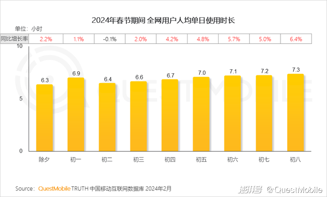QuestMobile数据显示,龙年春节假期日均活跃用户规模达到9.08亿,史上首次突破9亿大关,同比增长1.8%,同时用户粘性也持续提高,人均单日使用时长突破7小时,其中,短视频、移动社交两大领域分别占比31.0%、25.6%,合计占据了超五成用户注意力。