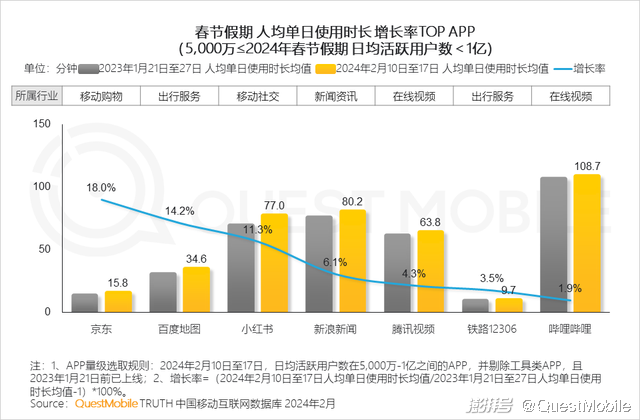 5、在日均流量5,000万-1亿APP中,京东、小红书APP作为2024年总台春晚合作伙伴,用户人均单日使用时长增长幅度较高,超过10%