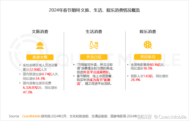 1、龙年春节,用户感受风土人情、品尝风味美食的需求释放,叠加春晚、春节档电影话题全网发酵与持续升温,文旅、生活、娱乐行业流量增长