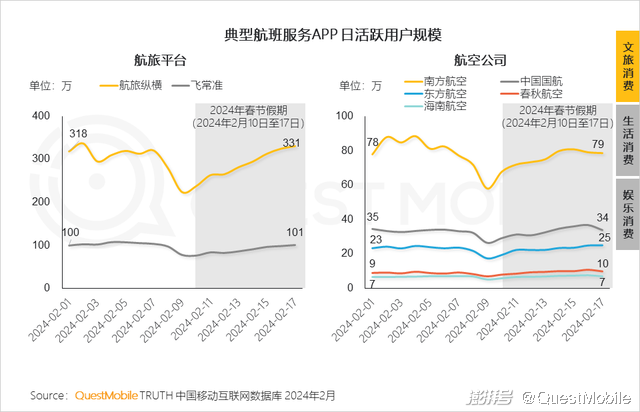 3、同时,春节假期长途旅行、出境游需求的增长,带动航旅平台、航空公司APP在假期流量持续增长