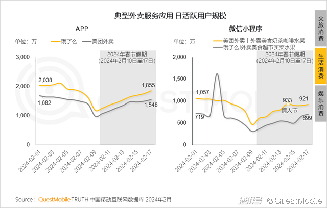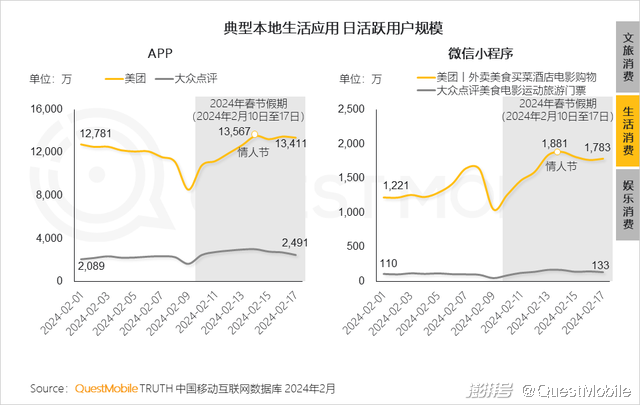 7、春节期间,在用户多项吃喝玩乐类本地生活需求的带动下,本地生活类平台用户活跃,同时平台各商家抓住初五情人节,促销“甜蜜” ,吸引关注