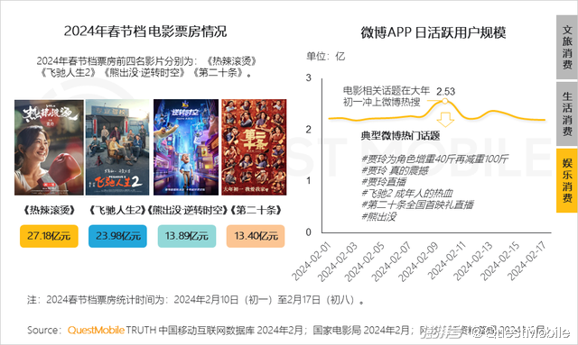 13、各大电影的系列营销话题随着电影上映在全网逐步发酵,大年初一微博APP用户规模达2.53亿,掀起2月以来第一波流量小高峰;《热辣滚烫》《飞驰人生2》票房超20亿元,位列春节档前二
