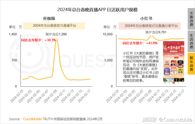 14、除夕当日,央视频作为2024年总台春晚官方直播平台,流量突破千万;小红书作为笔记与直播分享平台,依据平台特性开创《大家的春晚》互动性节目,丰富春晚内容形式,流量达到小高峰