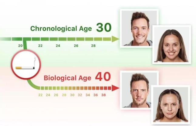 除此之外,美国一个研究癌症和衰老的团队曾发表了这么一项调研结果:吸烟会加速人的衰老,尤其是实际年龄在40岁以下的年轻人。抽烟女性的生理年龄是实际年龄的2倍;抽烟男性的生理年龄也是实际年龄的1.5倍。