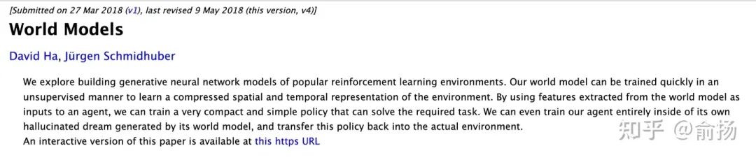 而今天world models这个词影响最大的,可能是Jurgen 2018年放到arxiv的这篇以「world models」命名的文章,该文章最终以 「Recurrent World Models Facilitate Policy Evolution」的title发表在NeurIPS‘18。