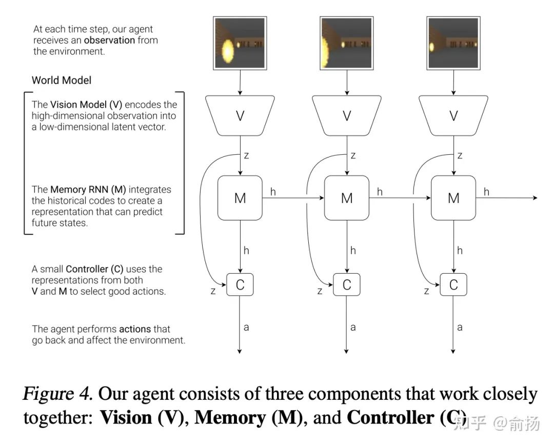 图中纵向V->z是观测的低维表征,用VAE实现,水平的M->h->M->h是序列的预测下一个时刻的表征,用RNN实现,这两部分加起来就是World Model。