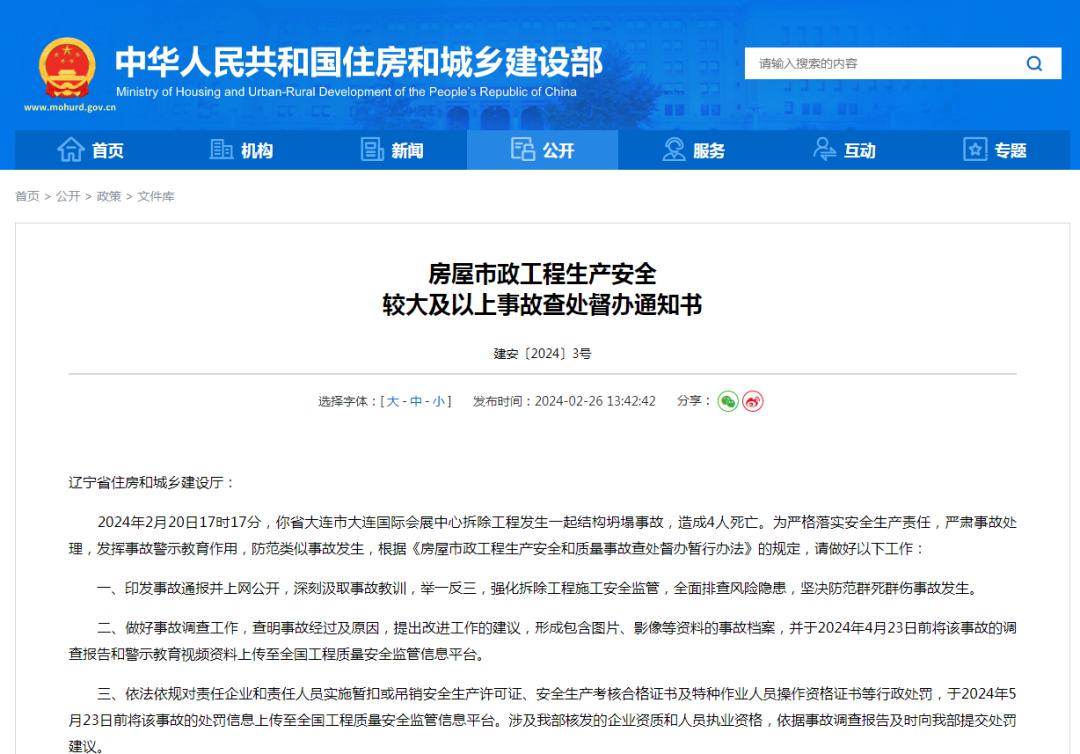 2月26日,住建部网站发布《房屋市政工程生产安全较大及以上事故查处督办通知书》。其中显示,2024年2月20日17时17分,辽宁省大连市大连国际会展中心拆除工程发生一起结构坍塌事故,造成4人死亡。通知书要求,辽宁省住房和城乡建设厅要印发事故通报并上网公开,深刻汲取事故教训,举一反三,强化拆除工程施工安全监管,全面排查风险隐患,坚决防范群死群伤事故发生。要做好事故调查工作,查明事故经过及原因,提出改进工作的建议,形成包含图片、影像等资料的事故档案,并于2024年4月23日前将该事故的调查报告和警示教育视频资料上传至全国工程质量安全监管信息平台。要依法依规对责任企业和责任人员实施暂扣或吊销安全生产许可证、安全生产考核合格证书及特种作业人员操作资格证书等行政处罚,于2024年5月23日前将该事故的处罚信息上传至全国工程质量安全监管信息平台。涉及住建部核发的企业资质和人员执业资格,依据事故调查报告及时向住建部提交处罚建议。