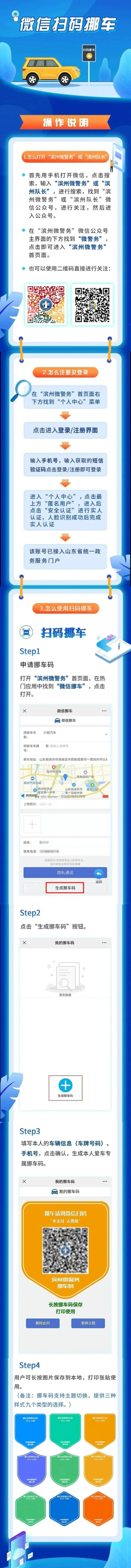 三是“滨州微警务”微信挪车,市民可在手机微信中关注滨州微警务公众号,根据提示操作使用。