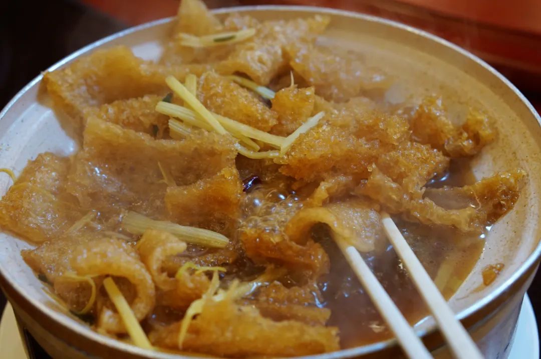 但是一上桌,就把炸猪皮、年糕、米糕一直往我面前推,神情里藏着自豪,这是我们这里的家乡菜。