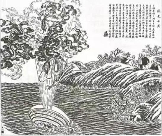 “贞丰里”是周庄镇的旧称。南湖俗称南白荡,在镇之南,广袤三里。这是发生在大白天的一幕,整个湖泊中的水都被吸入空中,然后再缓缓泻下——这一手绝活,不要说古代居民,就是自以为掌握了高科技的现代人也会目瞪口呆的。“蚌”和“龙”一样,都能够腾飞九霄。纂修于光绪年间的《周庄镇志》中,还有更直白的描述:当“蚌珠”飞上天空时,“日光与珠光相照耀,观者迷目”。“珠光”居然能与太阳争辉,让目击者的眼睛都睁不开,可见其光亮强度极为惊人。这一事件是有年代可考的,写明是清初顺治(1644—1661)年间。