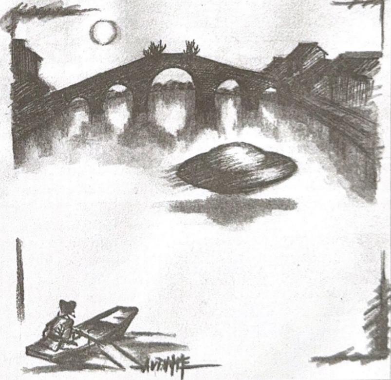 青浦朱家角放生桥下旧时有老蚌,渔人时见屹立波心,霞彩炫目(叶苇荼 绘)同样纂修于嘉庆年间的《贞丰拟乘》,其下卷记载了周庄镇一湖泊中发生的骇人事件,又是一出“龙蚌争斗”的好戏: