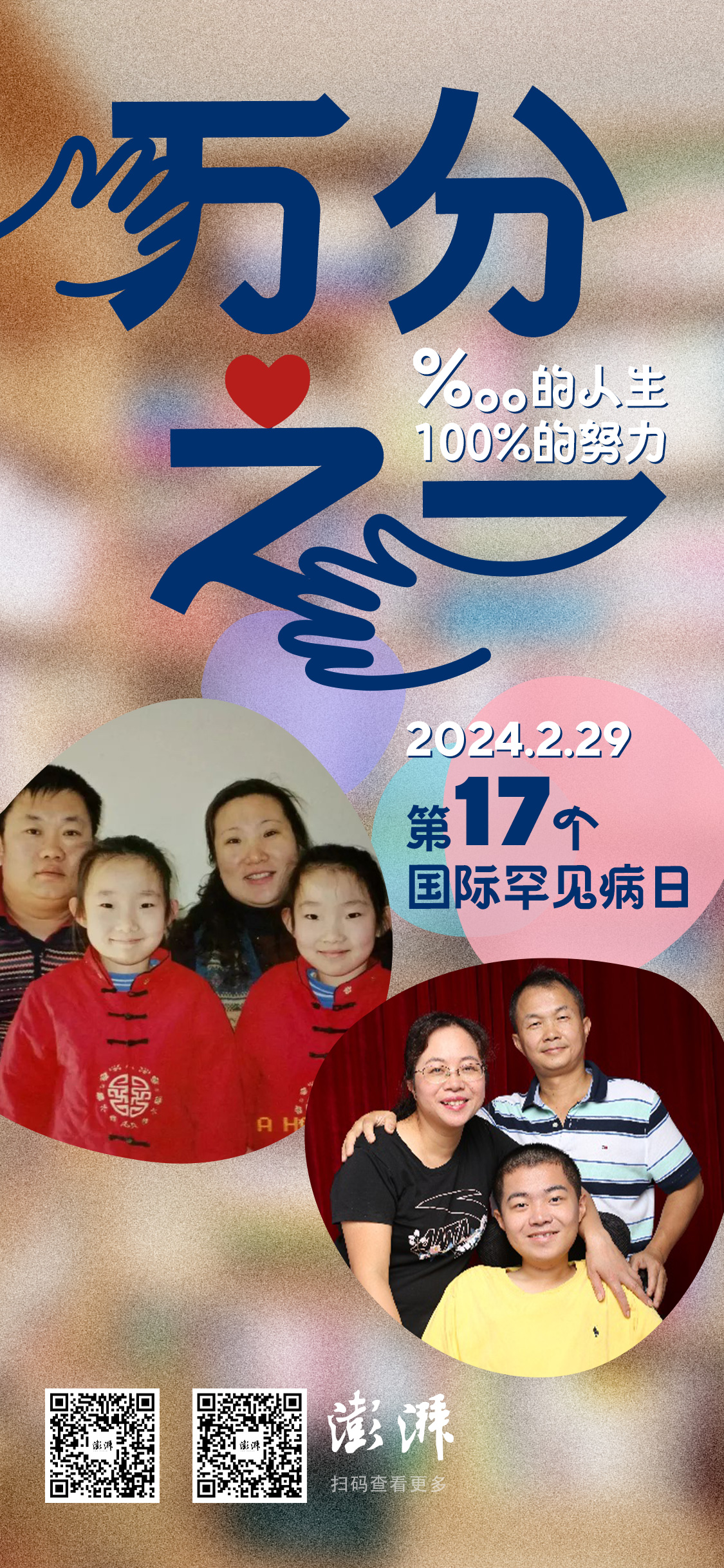 又一个“国际罕见病日”到来之际,澎湃新闻再次关注罕见病患者。记录他们“万分之一”的人生,以及身处困境所付出的百分之百努力。