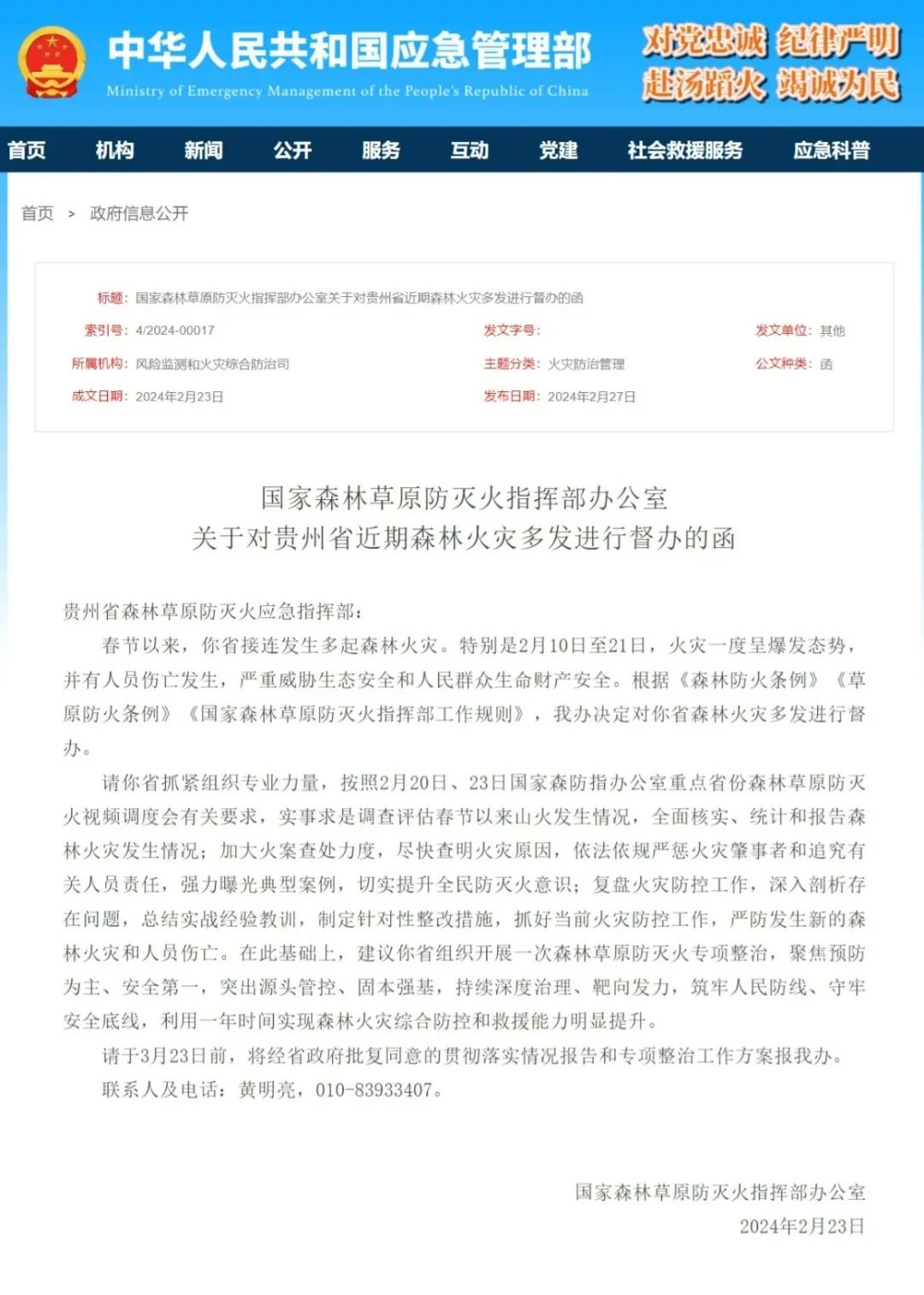 国家森林草原防灭火指挥部办公室关于对贵州省近期森林火灾多发进行督办的函