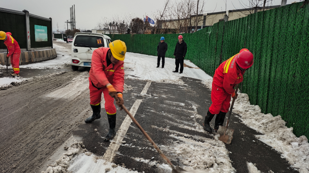近日,徐州市出现恶劣雨雪天气,低温天气给项目复工造成严重阻碍,项目部精心组织、提前部署,多措并举应对极端天气顺利复工。一是储备充足的工业盐、铁锹、沙子、防滑鞋、暖风机、手电筒、反光背心等应急物资设备;二是加强值班巡查力度,对施工现场和周边道路进行全面巡查,提前“撒盐”化雪,发现积雪和结冰及时清理。三是项目全体员工奋勇当先,积极参与清理积雪,用实战检验应急水平。