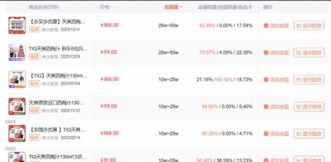 以东方甄选为例,其最早在2023年1月就开始给天萁西梅汁带货,近一年时间里,东方甄选直播间中TIQ天萁西梅汁的总销量在16万~34万件,总销售额在2000万~5000万元;再如,贾乃亮直播间最早在2023年4月7日给TIQ天萁西梅汁带货,销量达1000~2500件,销售额在25万~50万元之间。