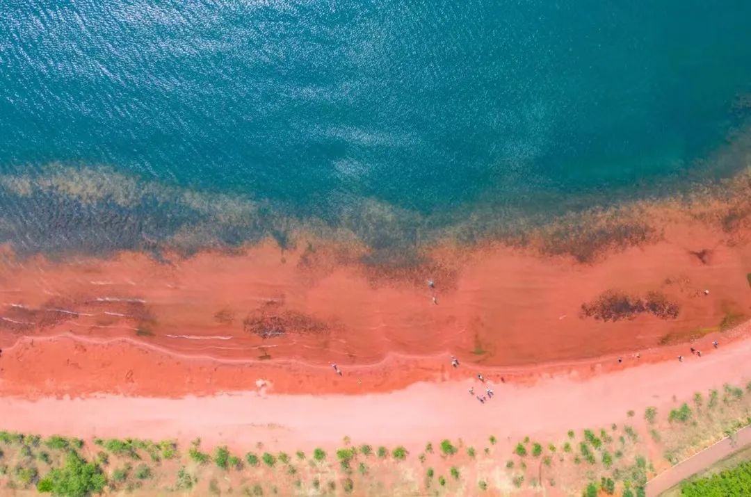 抚仙湖还有一处超级美的粉色沙滩——红山咀。湛蓝的湖泊,粉色的沙滩,绿色的树木点缀让这里美的惊人。