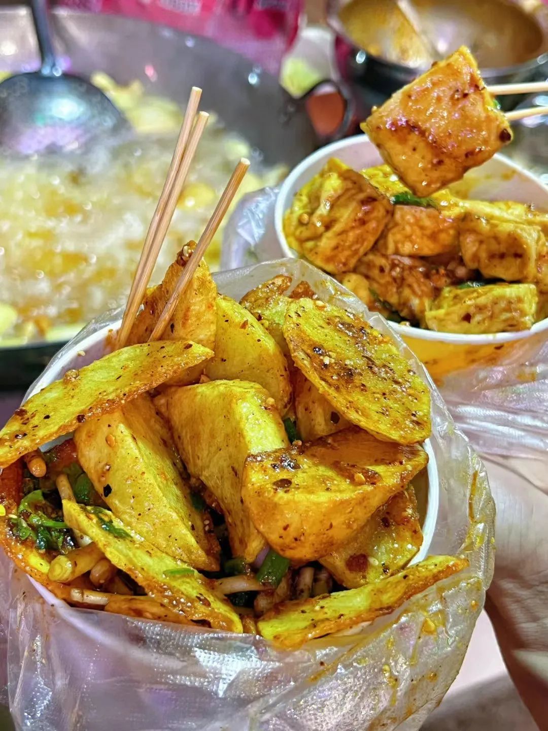 经过热油高温炸过的洋芋,有许多口味,五香、蒜蓉、麻辣,冬天吃上一口,热乎乎的一口满足。