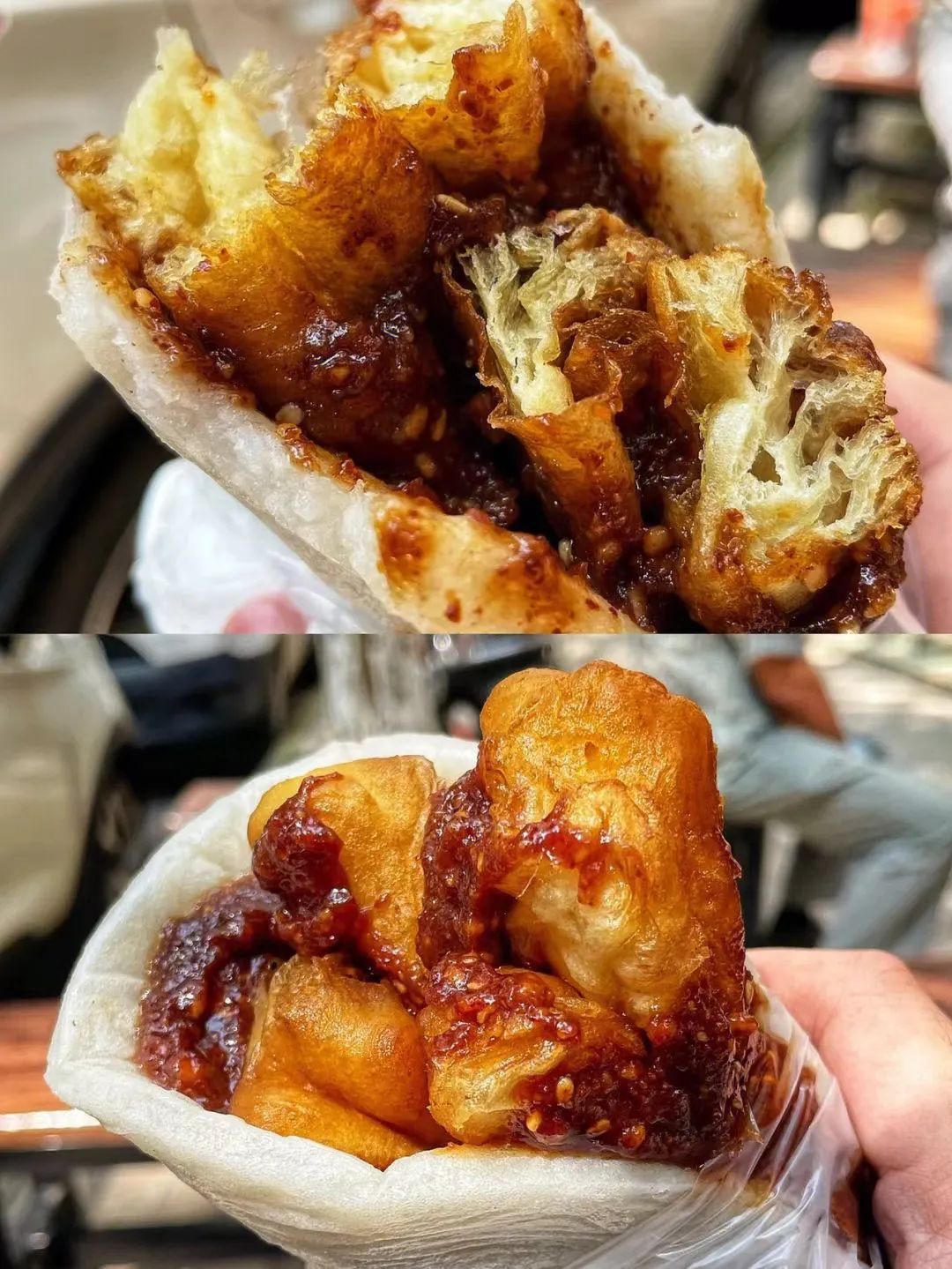 小红书@溏心菜叶子带着米香味的饵块,里面裹上油条,还刷上了芝麻酱、腐乳酱,一口吃下去,面食的满足感瞬间涌上来。