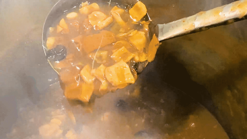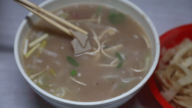 食客们来吃的时候,豪爽的老板会在碗内放上泡涨的粉条、煮熟的海带丝、虾皮、韭菜、胡椒粉、味精、醋,加上灵魂胡椒和酸爽陈醋,用锅中圆箍内的滚汤冲沏,在碗中再放张不翻饼就可以食用了。⇨ 胡辣汤+豆腐脑