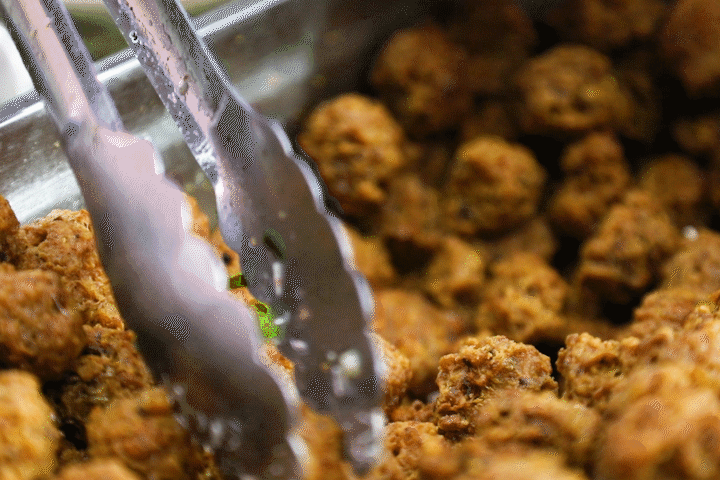点一份丸子汤再配上辣油、油旋,咬上一口浸满汤汁的酥脆丸子,喝一口汤,有焦有软、有脆有绵,在嘴里越嚼越“美”!⇨ 杂肝汤