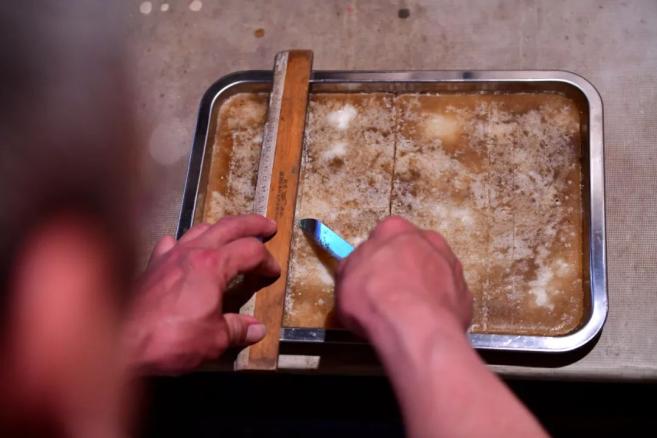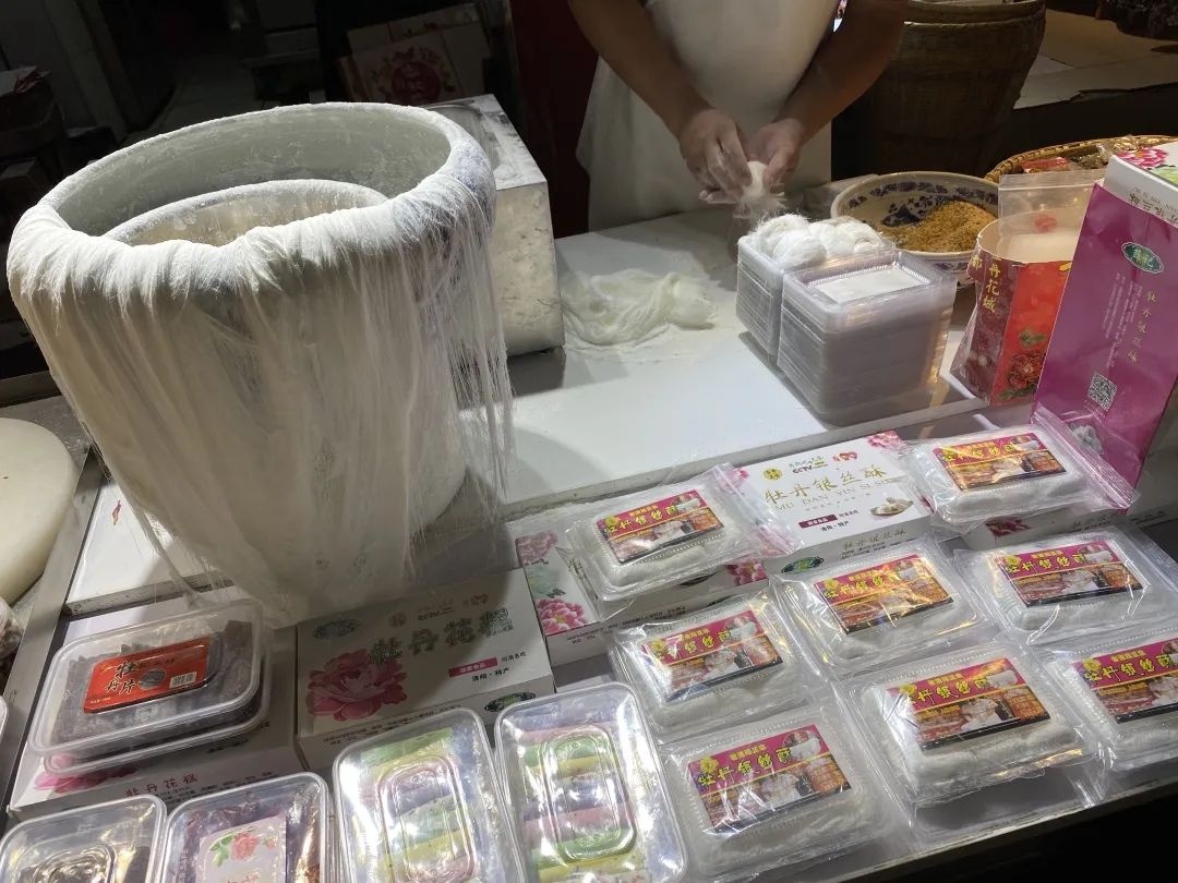 牡丹银丝酥的制作程序有几十道,需要用蜂蜜、高粱饴糖、麦芽糖熬制成能拉丝的糖膏;再将糖膏放进藕粉中,拉制成雪白的细丝;最后将花生、芝麻等诚意满满的碎料撒入其中,一盒重约150克的牡丹银丝酥才算完工。⇨ 牡丹鲜花饼