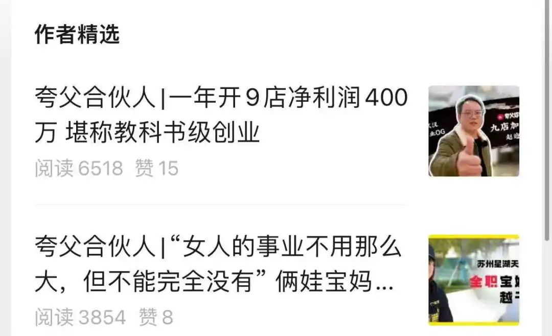 寻找加盟商的目标群体也非常清晰。夸父自己发的公众号文章中经常出现“从某某大厂离职的中年人”这一角色。深谙大厂规则的创始人带领下,一句“如今的许总,早已摆脱大厂35岁危机带来的压迫感,重新拿回生活的选择权”、“门店首月业绩突破20万”一出,给了不少焦虑大厂人希望。