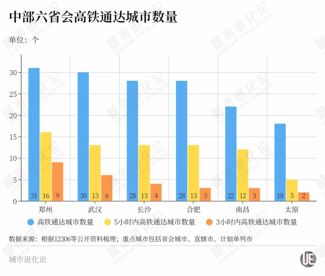 现阶段,谁是中部城市高铁枢纽?城叔梳理了中部6个省会城市与全国36个重点城市(包括直辖市、省会城市、计划单列市)间的高铁通达度,以及3小时、5小时内可通达的重点城市数量。