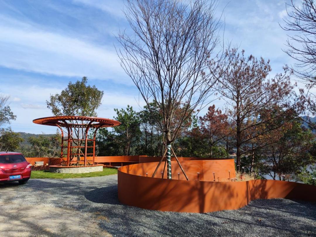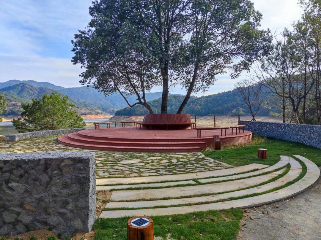 从发竹湾村往坂中村库区移民风景区第6个观景平台:该观景平台的场地面积相对较大,呈扇形形态,以保留现场现存乔木历史悠久,围绕树池特色涟漪状景观,融入古田特色文化形成打卡点。游客在此不仅能欣赏到大自然的秀美风光,更能感受到古田独特的地域文化和历史底蕴。