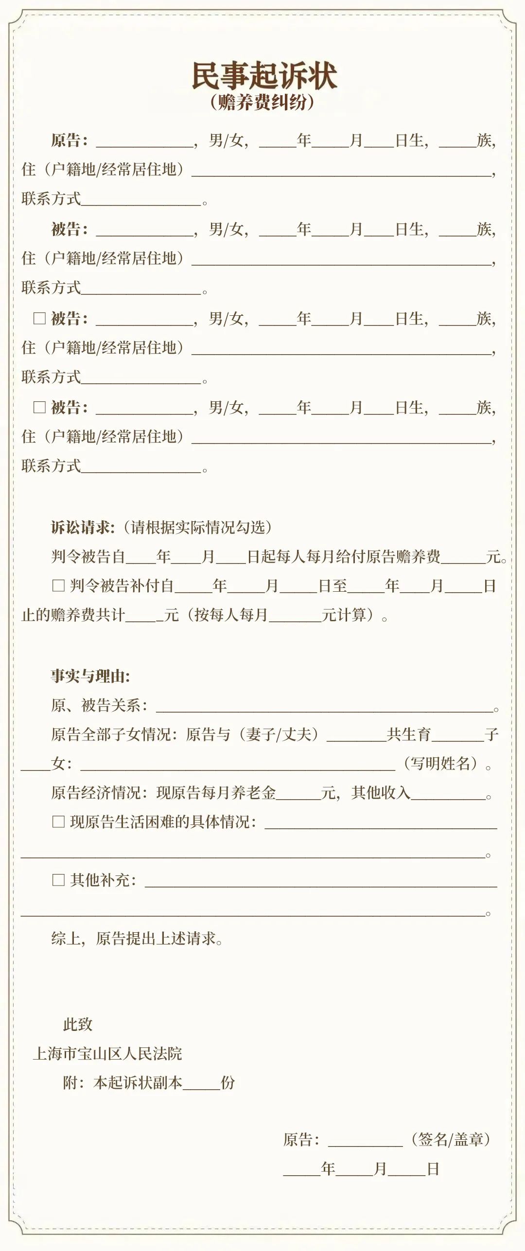 一、“原告”一栏此处应填写依法享有赡养权利的人,即赡养权利人,既包括生父母,也包括养父母和形成抚养教育关系的继父母。