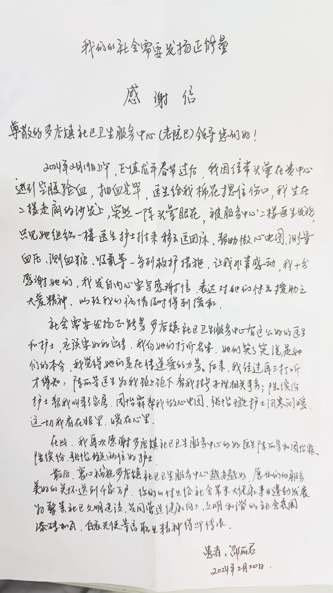 近期,罗店镇社区卫生服务中心收到一封居民手写的感谢信,感谢中心罗南家庭医生团队医生陈丽芳、周怡霖及护士陆缤纷、张怡璇工作认真负责、关爱居民。一封感谢信,体现出居民对中心服务品质的充分认可,也彰显医患关系的真诚与和谐。