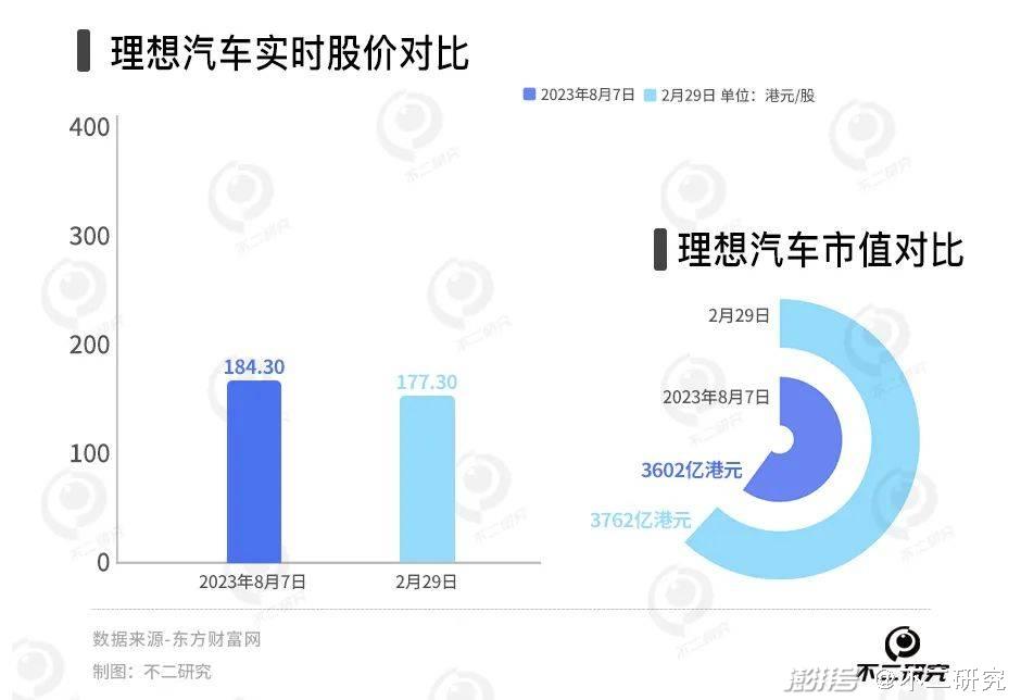 截至2月29日港股收盘,理想汽车报收177.30港元/股,对应市值3762亿港元(约折合人民币3457.84亿元;对比2023年8月的市值高点3602.05亿港元,其市值已经涨超160亿港元(约折合人民币147亿)。