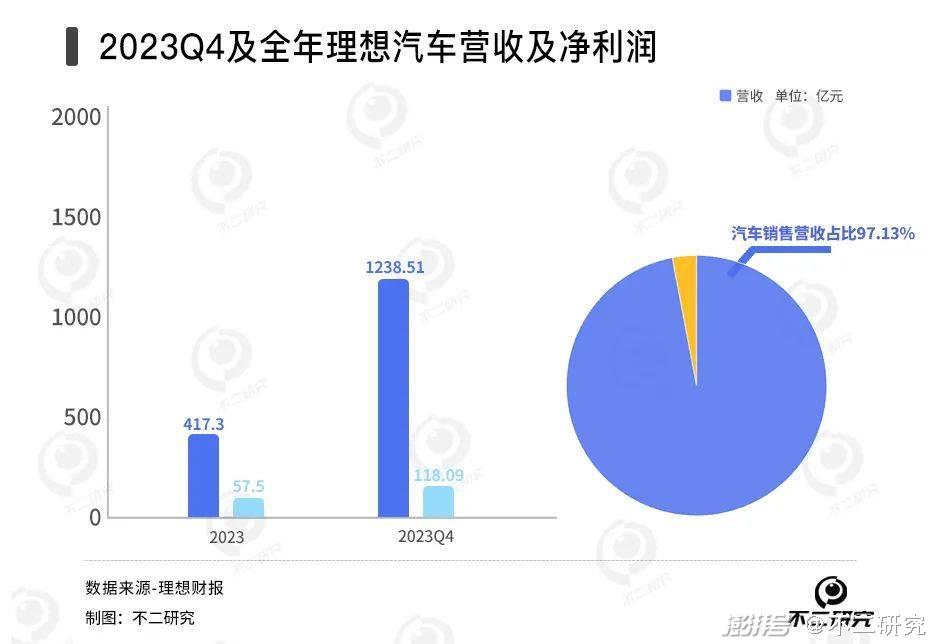 据理想财报显示,2023年,理想汽车营收1238.51亿元,同比增长173.48%;净利润118.09亿元,同比增长681.06%。其中第四季度,理想汽车营收417.3亿元,同比增长136.4%;净利润57.5亿元。