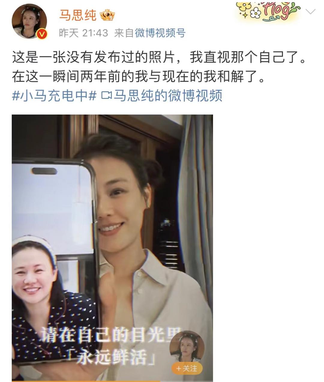 剧外的马思纯仿佛重生,许久不露面的她,半年减掉了50斤。在社交平台上她公开了自己最胖时候的照片,宣布与两年前的自己和解了。其实她不仅瘦了,在心态上也发生了变化。现在的她眼神有光,坚定而温柔,这种由内到外的转变不单单是减肥这么简单。