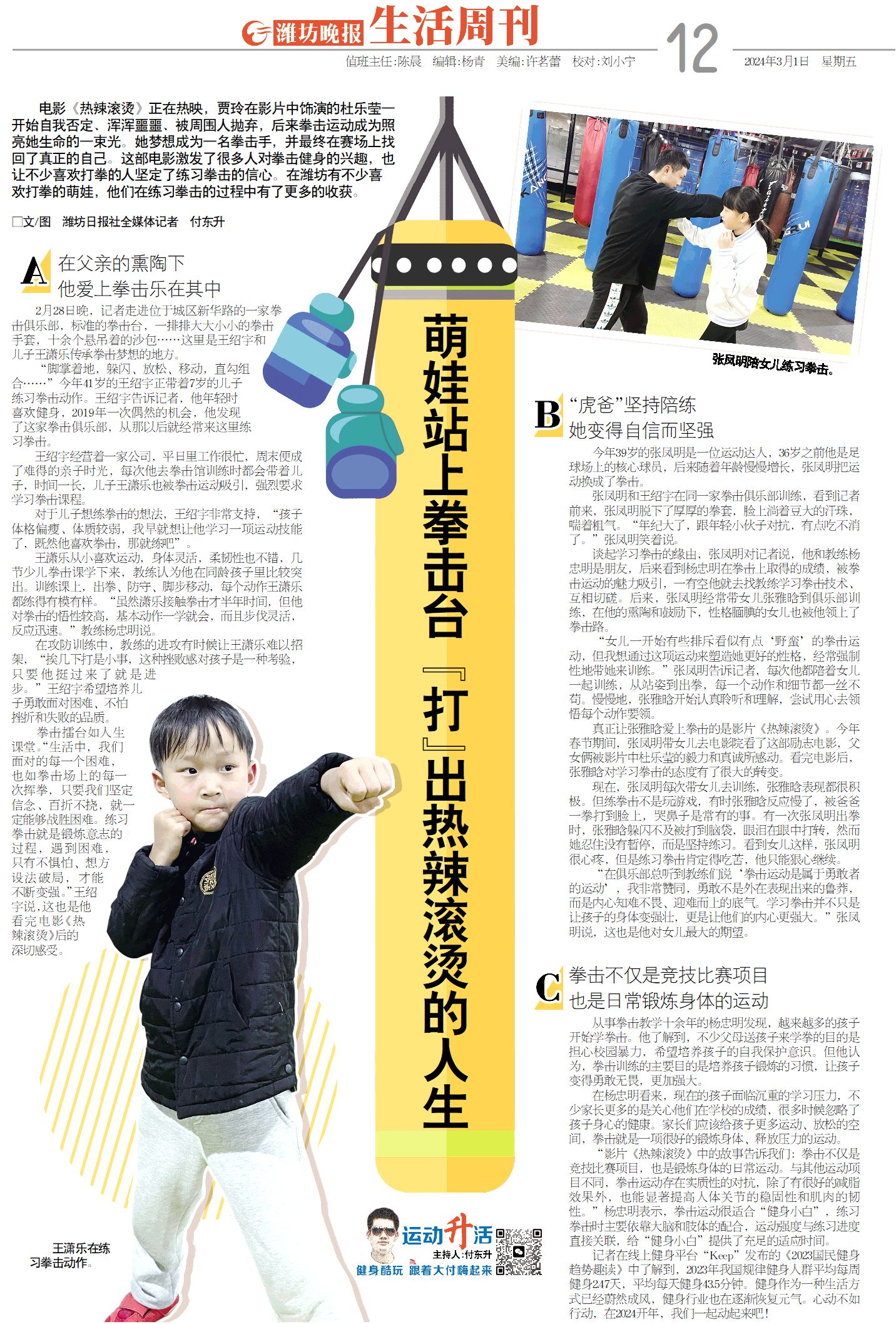 潍坊日报社潍坊融媒讯 电影《热辣滚烫》正在热映,贾玲在影片中饰演的杜乐莹一开始自我否定、浑浑噩噩、被周围人抛弃,后来拳击运动成为照亮她生命的一束光。她梦想成为一名拳击手,最终在赛场上找回了真正的自己。这部电影激发了很多人对拳击健身的兴趣,也让不少喜欢打拳的人坚定了练习拳击的信心。在潍坊也有不少喜欢打拳的萌娃,他们在练习拳击的过程中有了更多的收获。