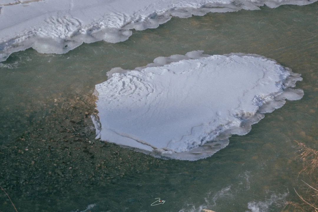 正好我看到两山之间的河流中,正在融化的一块冰岛,远看像墨鱼一样