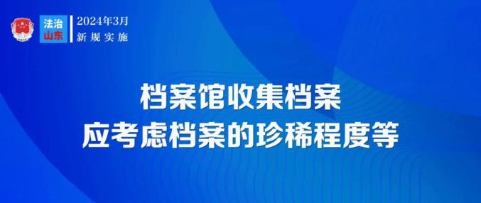 《中华人民共和国档案法实施条例》3月1日起实施。其中规范档案收集管理,明确归档责任和移交责任,要求档案馆收集档案应当遵守国家有关规定,考虑档案的珍稀程度、内容的重要性等。