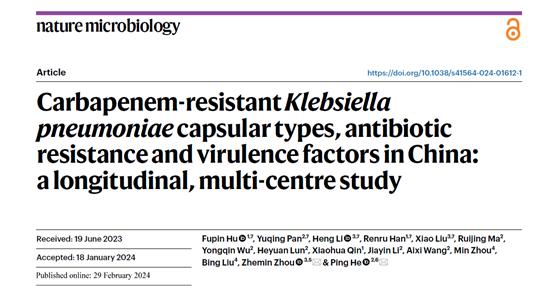 2月29日下午,复旦大学附属华山医院抗生素研究所胡付品团队在国际期刊Nature microbiology (IF=28.3)在线发表了题为“Carbapenem-resistant Klebsiella pneumoniae capsular types, antibiotic resistance and virulence factors in China: a longitudinal, multi-centre study”(《中国耐碳青霉烯肺炎克雷伯菌荚膜类型、抗生素耐药性和毒力因素的纵向多中心研究》)的研究论文。该研究在全国范围内进行了碳青霉烯类耐药肺炎克雷伯菌(CRKP)的流行病学调查,揭示了有关中国临床多中心分离的CRKP菌株荚膜类型、抗菌药物耐药和毒力因子谱的分布和纵向演变的特征。