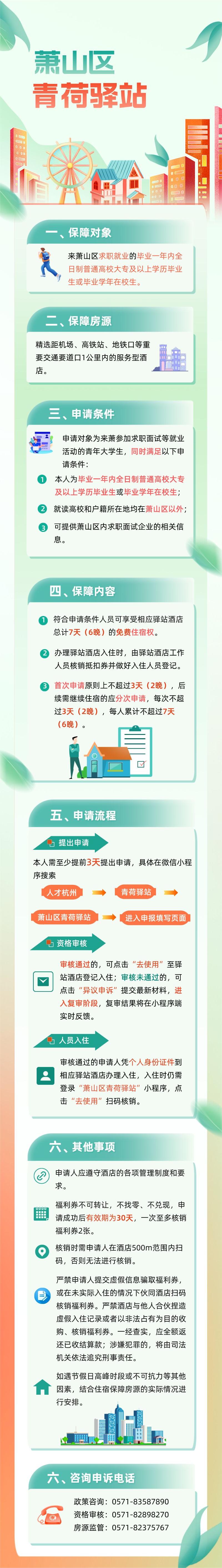 目前,我区首批青荷驿站选择萧山宾馆、宝盛宾馆、空港假日酒店、全季酒店等9家酒店,推出了140套房源。这些驿站主要在地铁口、高铁站、机场附近,出行交通较为便利。各驿站大堂前台,还设置了“就业创业一码通”,来萧大学生可通过扫码获取最新人才就业相关政策、求职活动、招聘信息等内容。