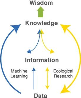 图1 数据、信息、知识和智慧之间的关联示意图。数据反映出原始的观察或测量(例如,某特定地点的海面温度卫星数据),而将这些测量整合成有意义的形式则构成了信息(例如,通过时间序列地图为海面温度测量赋予空间或时间背景)。知识增加了情境,提供类似案例或与其他知识体系的比较(例如,部分海洋生物将遭受热应激)。最后,智慧考虑所有这些元素以及社会或文化价值,来评估可能的行动(例如,设定碳排放限制以缓解气候变暖的负面效应)。箭头代表了机器学习(蓝色)和生态系统研究(黄色)在该框架内如何实现连接。机器学习能够将数据转化为信息,也可以跳过信息步骤直接推导出知识。相比之下,生态学中的双向箭头代表了对数据收集过程进行迭代反馈,以通过统计建模和假设修正实现知识获取。如果我们能够结合每个学科的优势,明确识别出偏见,并管理不确定性与不同的认知方式,尤其在信息和知识层面上,那么机器学习-人工智能和生态系统科学的有意识、协同的进步可能会推动对复杂系统功能的更深入理解、预测和保护。