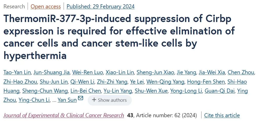 2024年2月29日,南方医科大学肖东、孙妍、汪佳宏和赵冰夏共同在《Journal of Experimental & Clinical Cancer Research》上发表题为“ThermomiR-377-3p-induced suppression of Cirbp expression is required for effective elimination of cancer cells and cancer stem-like cells by hyperthermia”的研究论文,充分研究了单独或联合化疗或放疗对鼻咽癌癌细胞和干细胞样癌细胞的直接细胞杀伤活性。另一方面,我们阐明了Cirbp在体外和体内鼻咽癌治疗热疗中的潜在功能,以及热耐性和热敏化的分子机制。