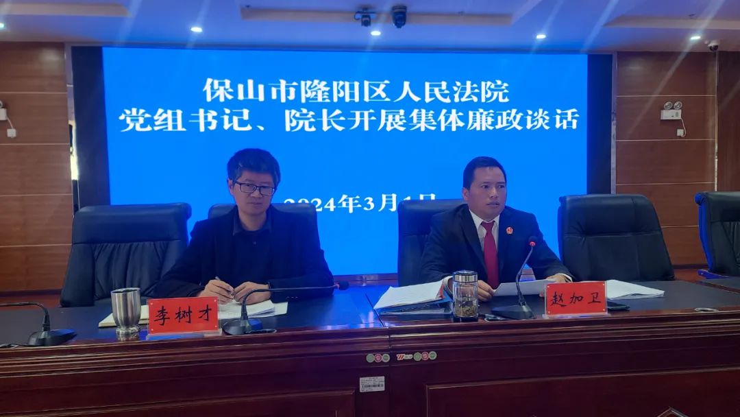为持续强化全面从严治党主体责任,进一步加强队伍建设和纪律作风建设。3月1日下午,隆阳区人民法院党组书记、院长赵加卫与党组成员、各部门负责人和实职科级干部开展集体廉政谈话。