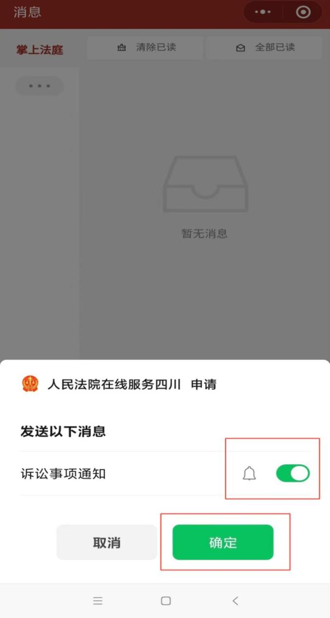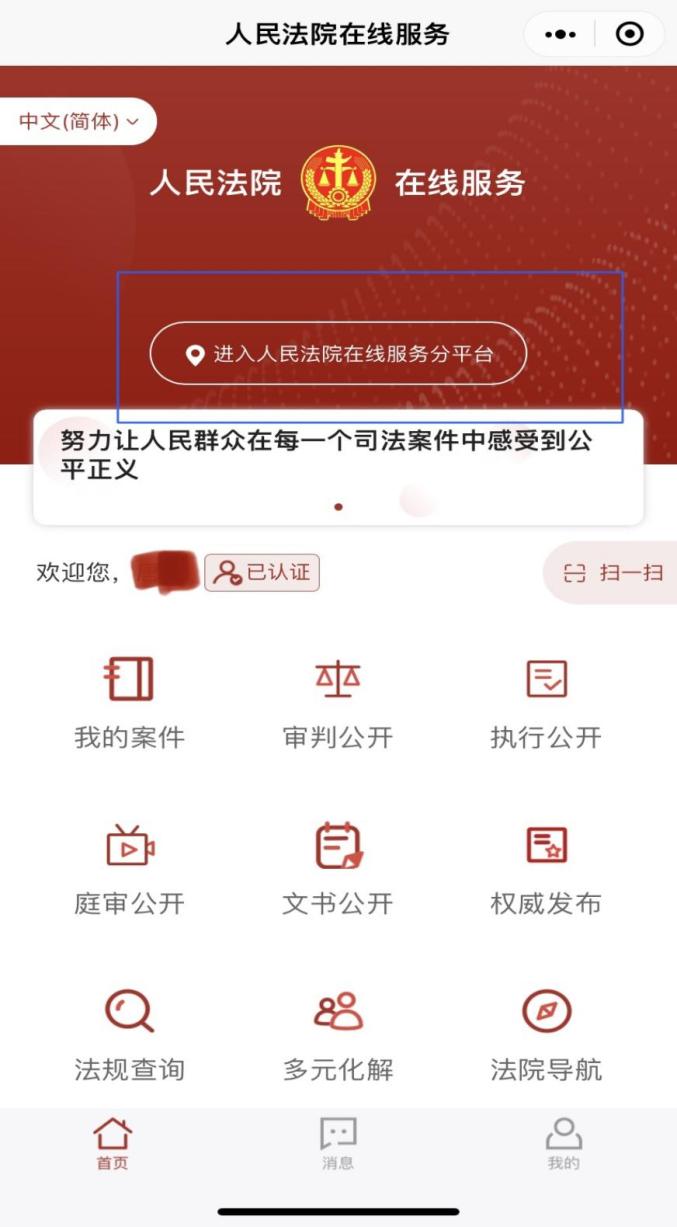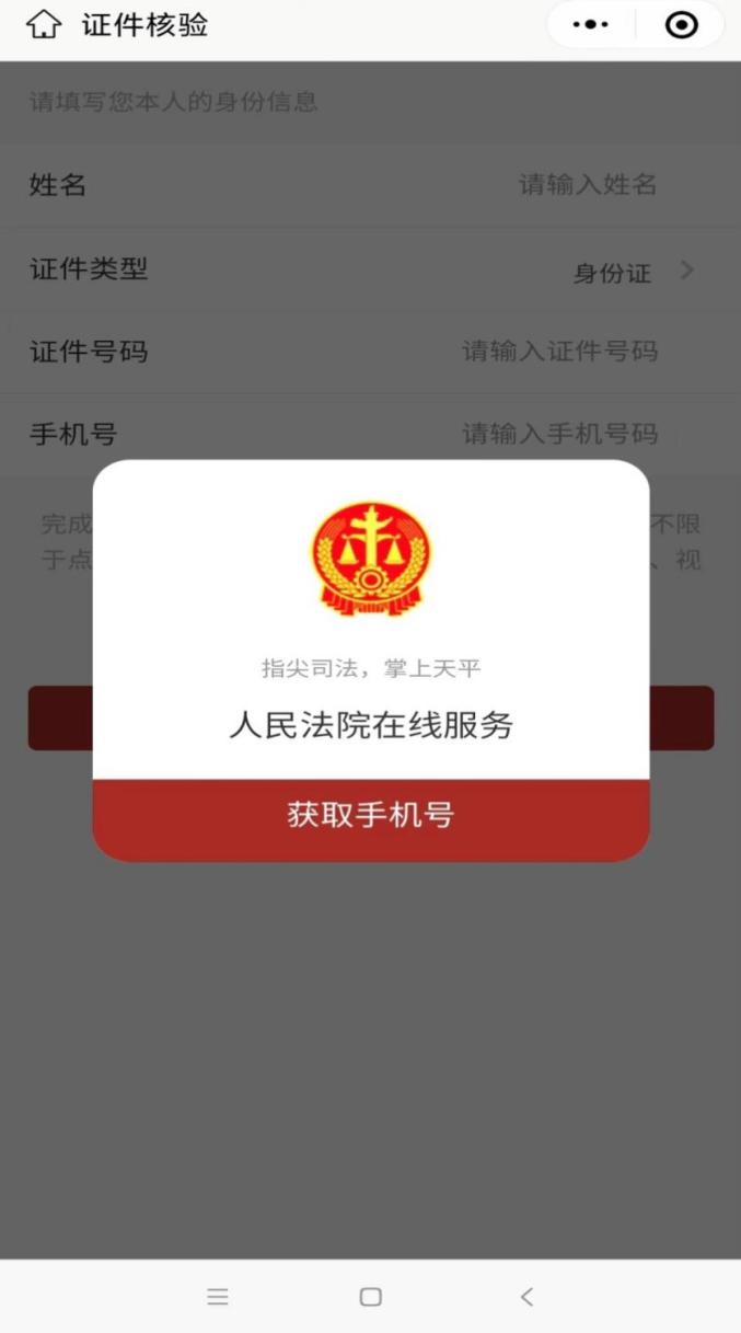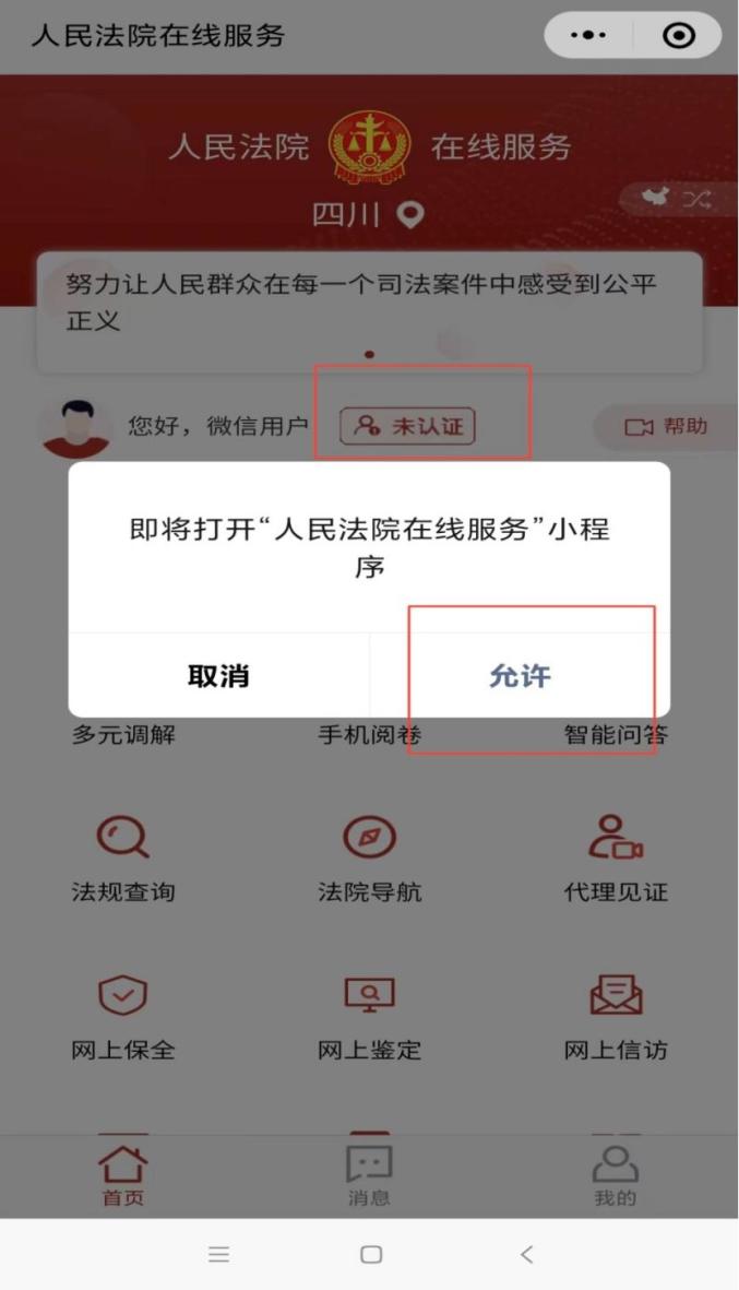 2.实名注册并完成身份验证。进入平台后,点击首页“未认证”处,弹出图1对话框,点击“允许”,进入图2界面,点击“获取手机号”并根据页面提示输入姓名、证件号码、手机号进行认证,操作完成后,首页界面如图3,点击“消息”打开“诉讼事项通知”设置(图4),便于及时收到消息提示和查看案件相关动态。