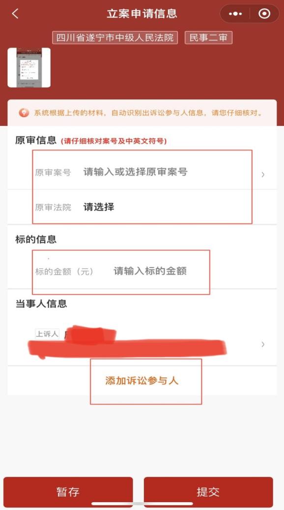 (图15)点击图10“下一步”后,跳转为图16“立案申请信息界面”,可手动输入(请保持在英文格式状态下输入案号的括号)或选择原审案号(如无法查找原审案号,请拨打前述座机),注意核对原审法院、案号是否准确;“标的信息”为上诉时请求标的数额,可选择是否填写;“当事人信息”的“添加诉讼参与人”处准确、完整填写上诉人、被上诉人身份信息,有代理人的一并填写。全部确认无误后,点击“提交”。