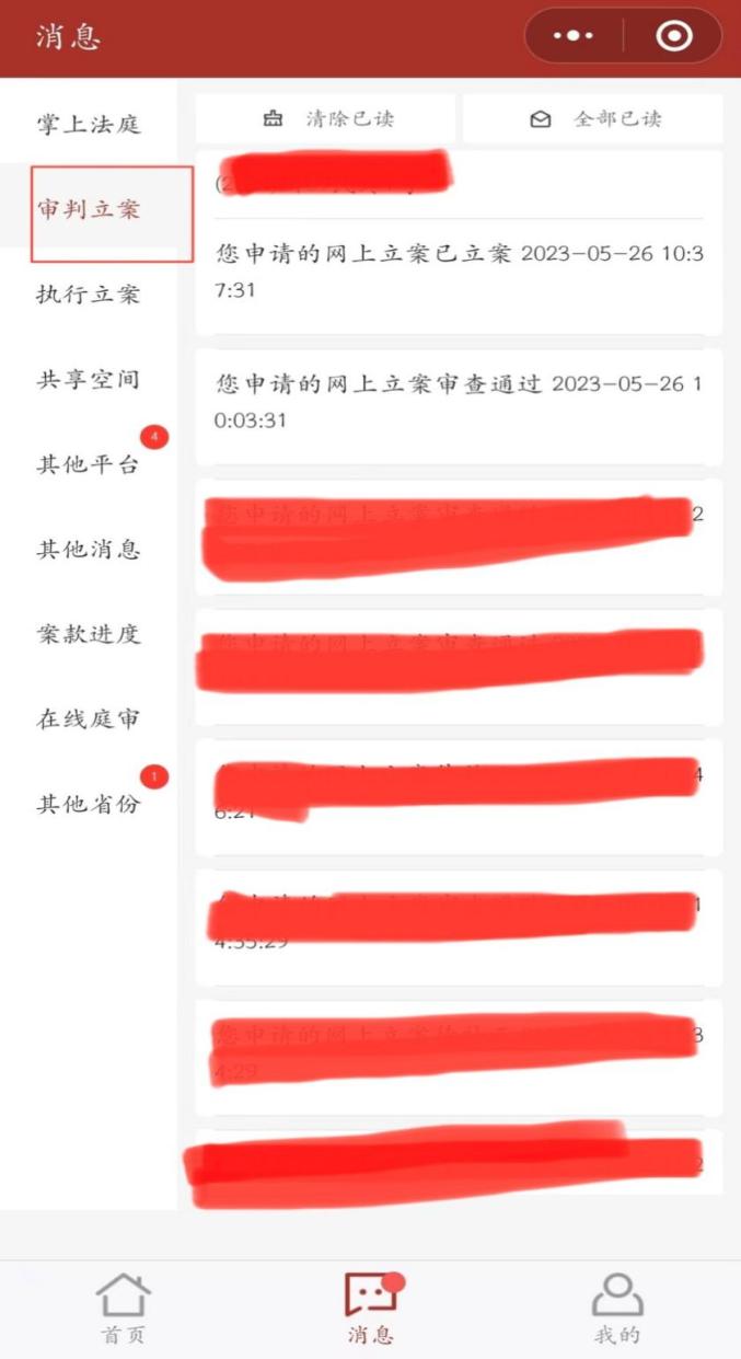 (图17)“提交中”表示系统提交上诉申请中,“待审核”表示提交成功等待法院处理;“审核通过”表示二审法院上诉审查通过,此时上诉人确认的手机号码会收到12368短信通知(图18),小程序“消息”中“审判立案”(图19)亦会有消息提示,当事人只需耐心等待二审法院立案即可;“已立案”表示二审法院已经完成二审立案工作。
